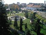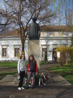 A megkoszorúzott Csoma szobor Kovászna központjában, háttérben a Művelődési Ház épülete, melyben a könyvtár is működik.e-mail:bibliotecacovasna@yahoo.com